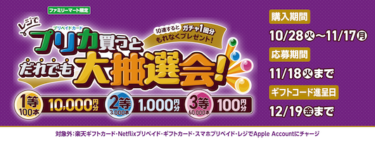 楽天ギフトカード、Netflixプリペイド・ギフトカード、スマホプリペイド、レジでApple Accountにチャージ、マルチコピー機でご購入いただけるプリペイドの商品は本キャンペーンの対象外ですのでご注意ください。