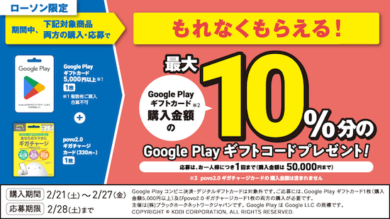キャンペーン期間中、ローソン(ナチュラルローソン、ローソンストア100)で5,000円以上のGoogle Play ギフトカードとpovo2.0 ギガチャージカード(330円〜)を両方購入してキャンペーンサイトから応募するともれなくGoogle Play ギフトコード(最大10%分)をプレゼントするキャンペーンです。