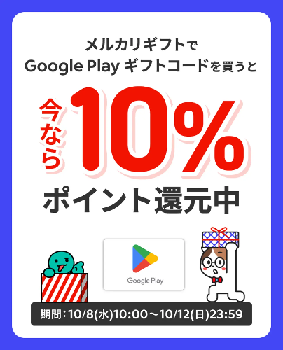 2025年10月8日(水)10:00〜10月12日(日)23:59の期間中、メルカリギフトでGoogle Play ギフトコードを購入された方にもれなく10%分のメルカリポイントをプレゼントするキャンペーンが実施されます。