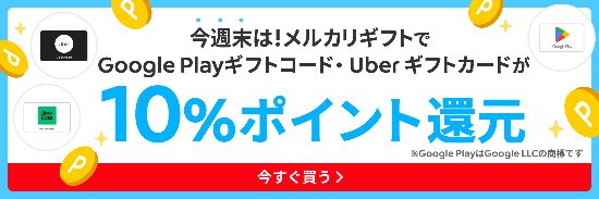 キャンペーン期間中、メルカリギフトでGoogle Play ギフトコード・Uber ギフトカードを購入すると、購入金額の10%分のメルカリポイントがもれなくプレゼントされます。