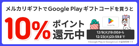 2025年12月9日(火)19:00〜12月23日(火)23:59の期間中、メルカリギフトでGoogle Play ギフトコードを購入された方にもれなく10%分のメルカリポイントをプレゼントするキャンペーンが実施されます。エントリーが必要です。