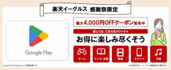 キャンペーン期間中、楽天市場 Google Play ギフトカード認定店で割引クーポンを取得して、10,000円以上のGoogle Play ギフトコードを割引購入することができます。