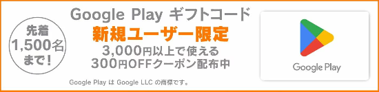 キャンペーン期間中、楽天市場 Google Play ギフトカード認定店でGoogle Play ギフトコードを初めて購入する方限定、3,000円以上の購入に使える300円OFFクーポンがもらえるキャンペーンです。