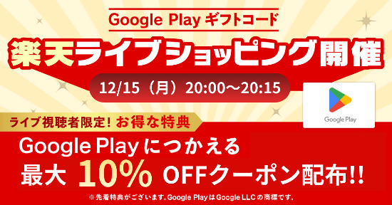 【2025年12月15日20:00〜20:15】楽天市場、Google Play ギフトコード認定店「ライブショッピング」開催