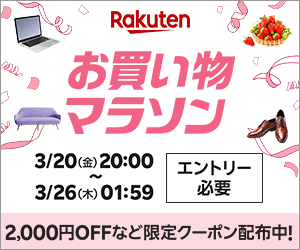 2026年3月20日(金)20:00〜3月26日(木)1:59の期間中、楽天市場で「お買い物マラソン」が実施されます。ショップ買いまわりで楽天ポイントが最大11倍もらえます(ラクマ1倍分含む)。