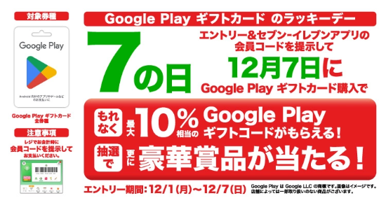 2025年12月7日(日)の「7の日」に、キャンペーンにエントリー後、セブン-イレブンアプリを提示してGoogle Play ギフトカードを購入すると、もれなく最大10%分のGoogle Play ギフトコード、さらに抽選で豪華賞品が当たるキャンペーンが実施されます。